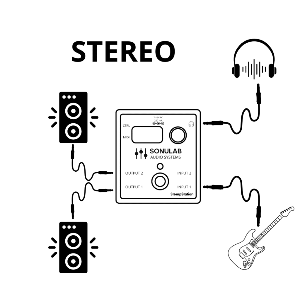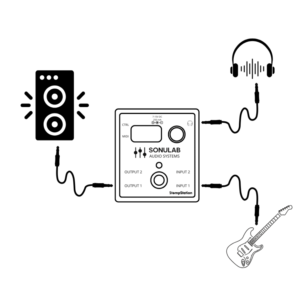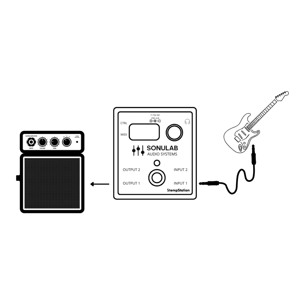 Control your StompStation with any MIDI controller. Use MIDI PC (Program Change) messages to instantly switch presets, and MIDI CC (Control Change) messages to turn individual effects on or off.