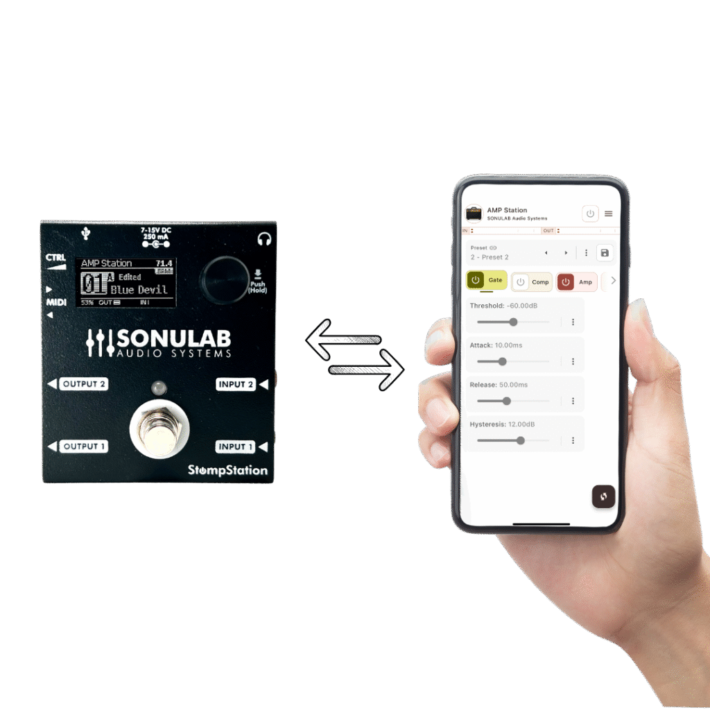 StompStation is a standalone hardware unit: it works instantly, no phone or computer required. When needed, wireless connection enable optional control via the VoidX Control app.