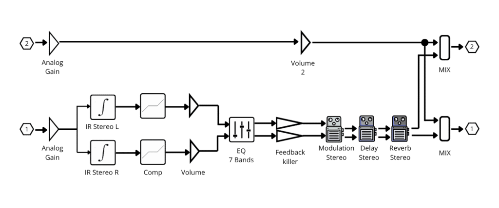 INPUT 1 serves as your main instrument input, INPUT 2 is mixed directly at the end of the signal chain, perfect for use with backing tracks or other external audio.